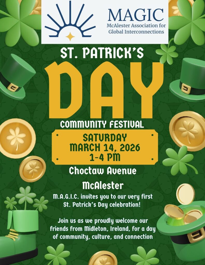 McAlester is going GREEN!The McAlester Association for Global Interconnections (MAGIC) invites you to our St. Patrick’s Day Community Festival on Saturday, March 14 from 1–4 PM.
